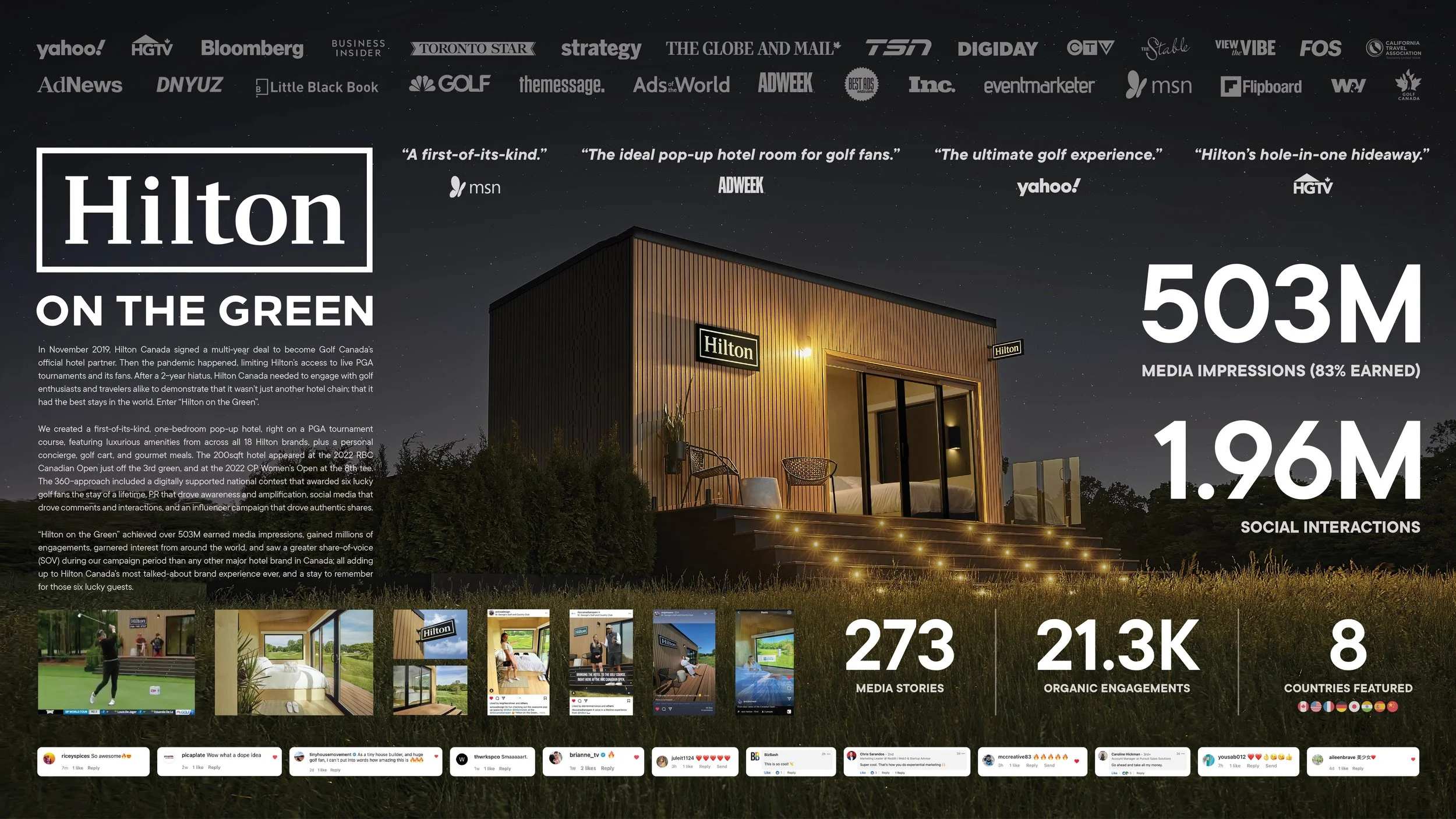 To demonstrate that Hilton's family of hotels offers the best stays in the world, we created a first-of-it's-kind pop-up hotel right on the tournament course at the PGA Canadian open. It was Hilton's most successful activation ever, garnering over half a billion impressions.
